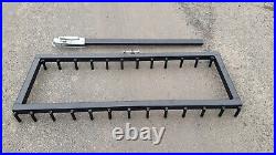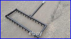 Horse arena leveller with a removable towing bar with a trailer coupling fixed at one end which attaches to any standard 50 mm tow ball found on most vehicles. It gives a more stable and straight tow eliminating side to side movement and bounce. Dimensions of levellers are 4 ft x 1 ft 5″, 2 x rows of 2″ solid round bar scarifying tines these loosen build up and level out the arena the other side can also be used for smoothing out the top surface once you have raked the entire surface. Can be used on most surfaces and easily stored and lifted by one person. Also very effective on large gravel driveways to rake out gravel and rake leaves and works great as a harrow on paddocks to scarify and regenerate grass and knock down mole hills or level around a muddy gate way etc. (Please note deliver to uk mainland only).